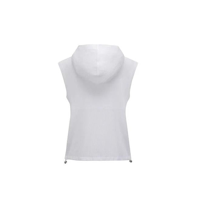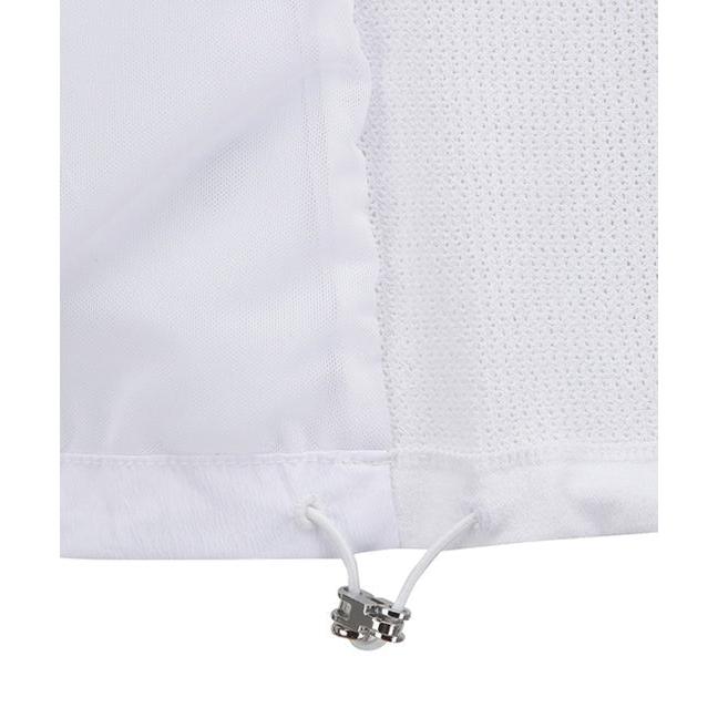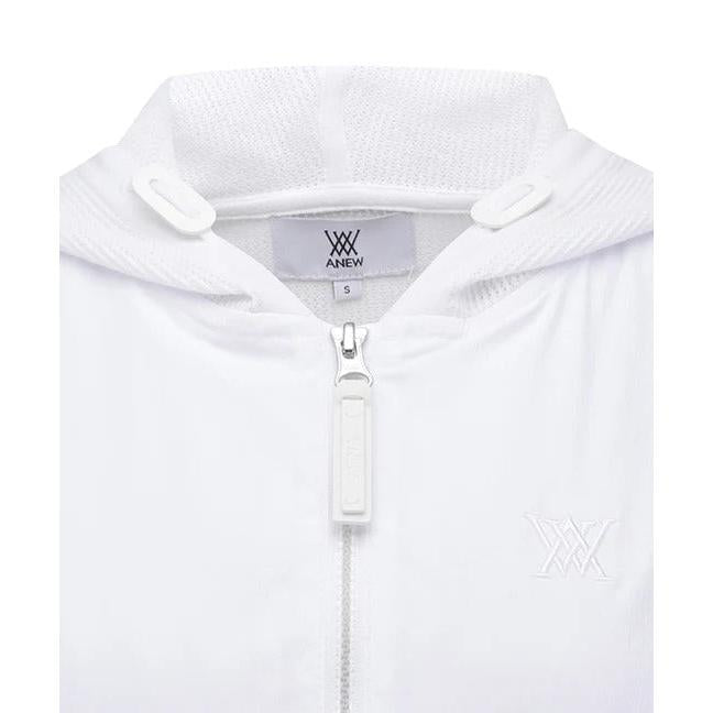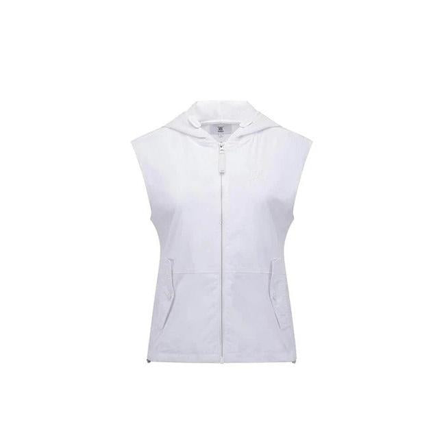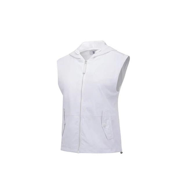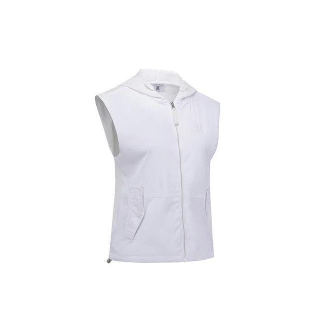 This is a hybrid hooded open knit vest made with a naturally wrinkled woven fabric overall. It is a style that uses a breathable mesh fabric on the back and has a partial logo point. Woven pockets are used on the front, and a special zipper is used as a focal point. It is easy to coordinate with base layers or basic items.