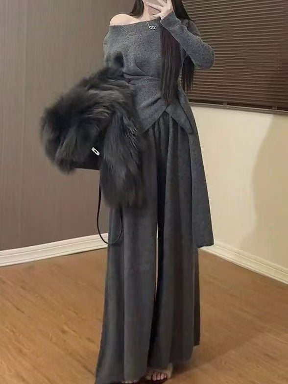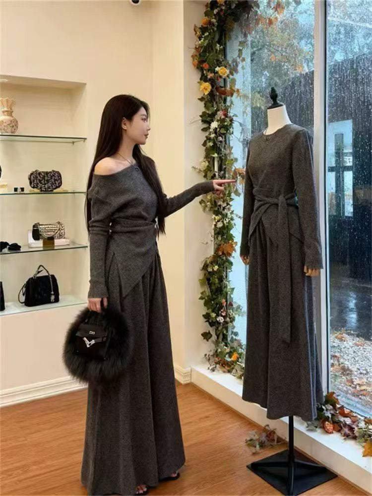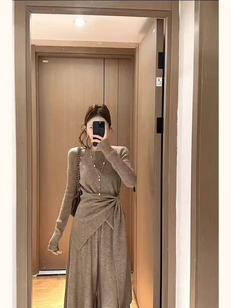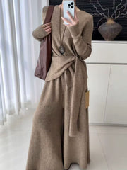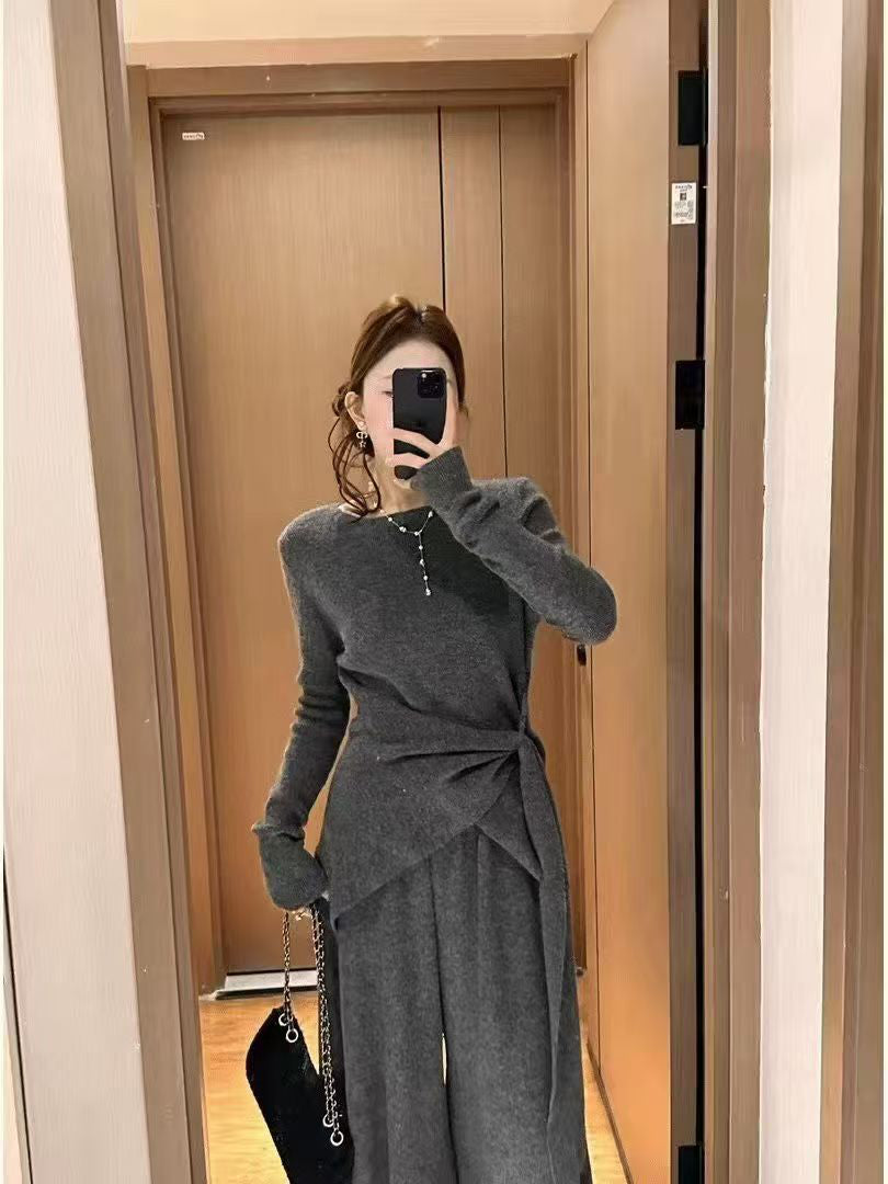 Effortless elegance defines The Knot-Front Set, a coordinated knit ensemble designed for modern sophistication. The long-sleeved top features a distinctive asymmetrical tie that drapes gracefully at the hip, creating a sculptural silhouette that flatters every frame. Paired with fluid wide-leg trousers, this set moves with easy grace while maintaining its polished structure. Crafted from a substantial yet comfortable knit fabric, it offers both cozy warmth and contemporary style—perfect for transitioning from casual daytime wear to evening engagements with minimal effort.