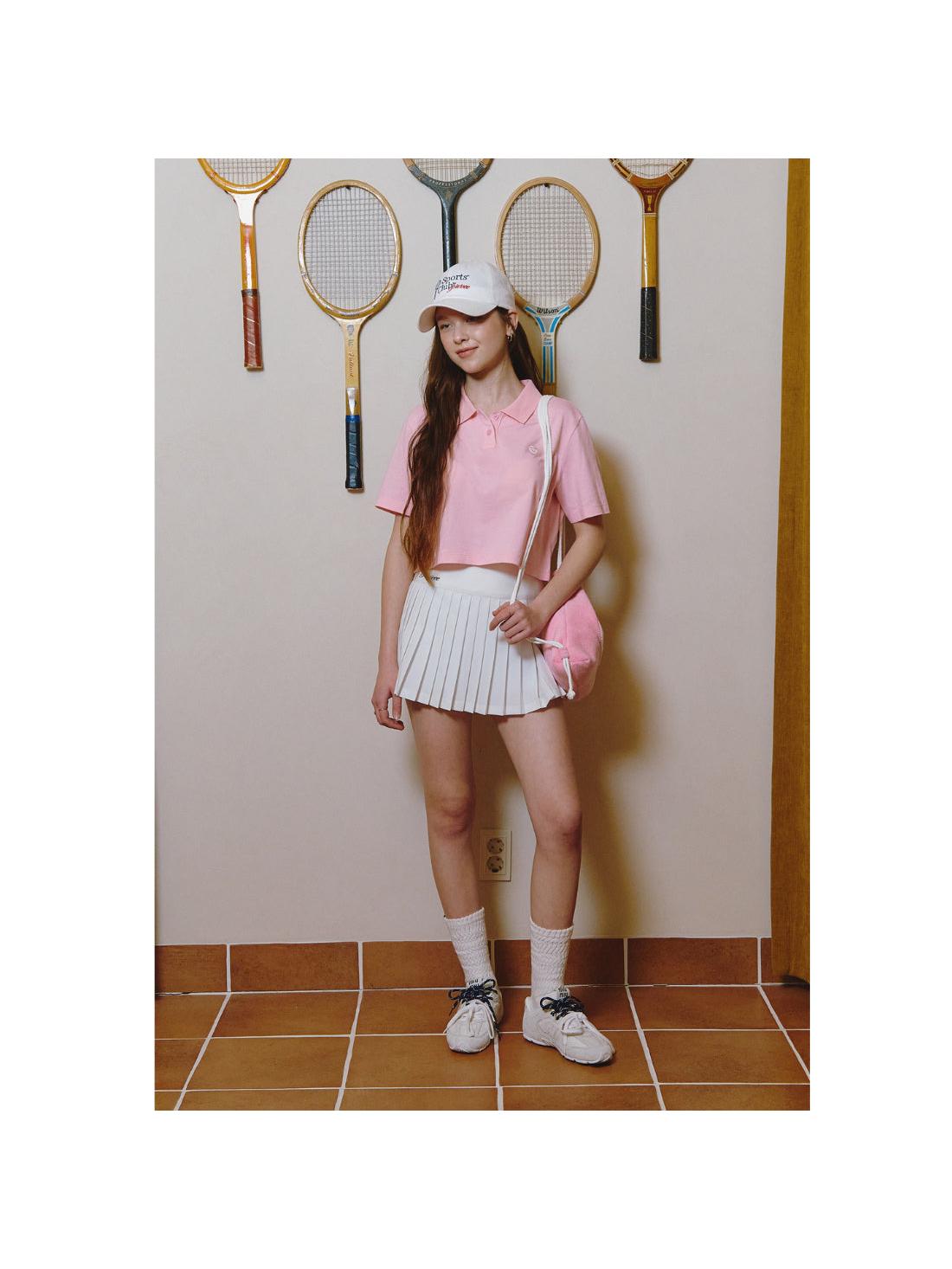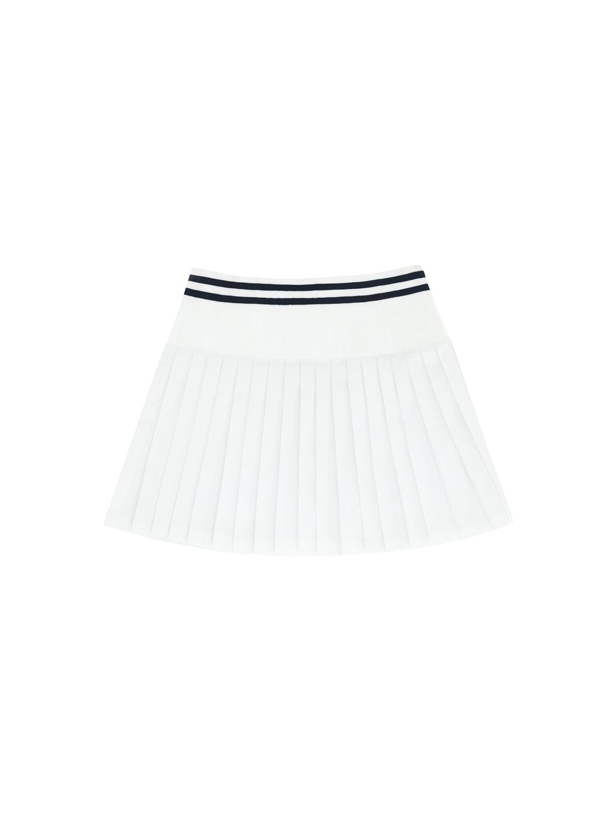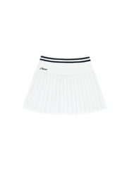 This pleated mini skirt features a ribbed textured waistband, ensuring a comfortable fit. The waist is accented with a striped color point for a stylish touch, while the front showcases a PvB lettering logo embroidery detail. Designed for comfort and practicality, the skirt also includes attached underpants, making it ideal for active activities.
