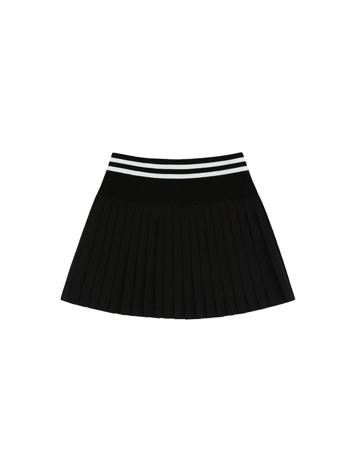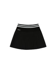 This pleated mini skirt features a ribbed textured waistband, ensuring a comfortable fit. The waist is accented with a striped color point for a stylish touch, while the front showcases a PvB lettering logo embroidery detail. Designed for comfort and practicality, the skirt also includes attached underpants, making it ideal for active activities.
